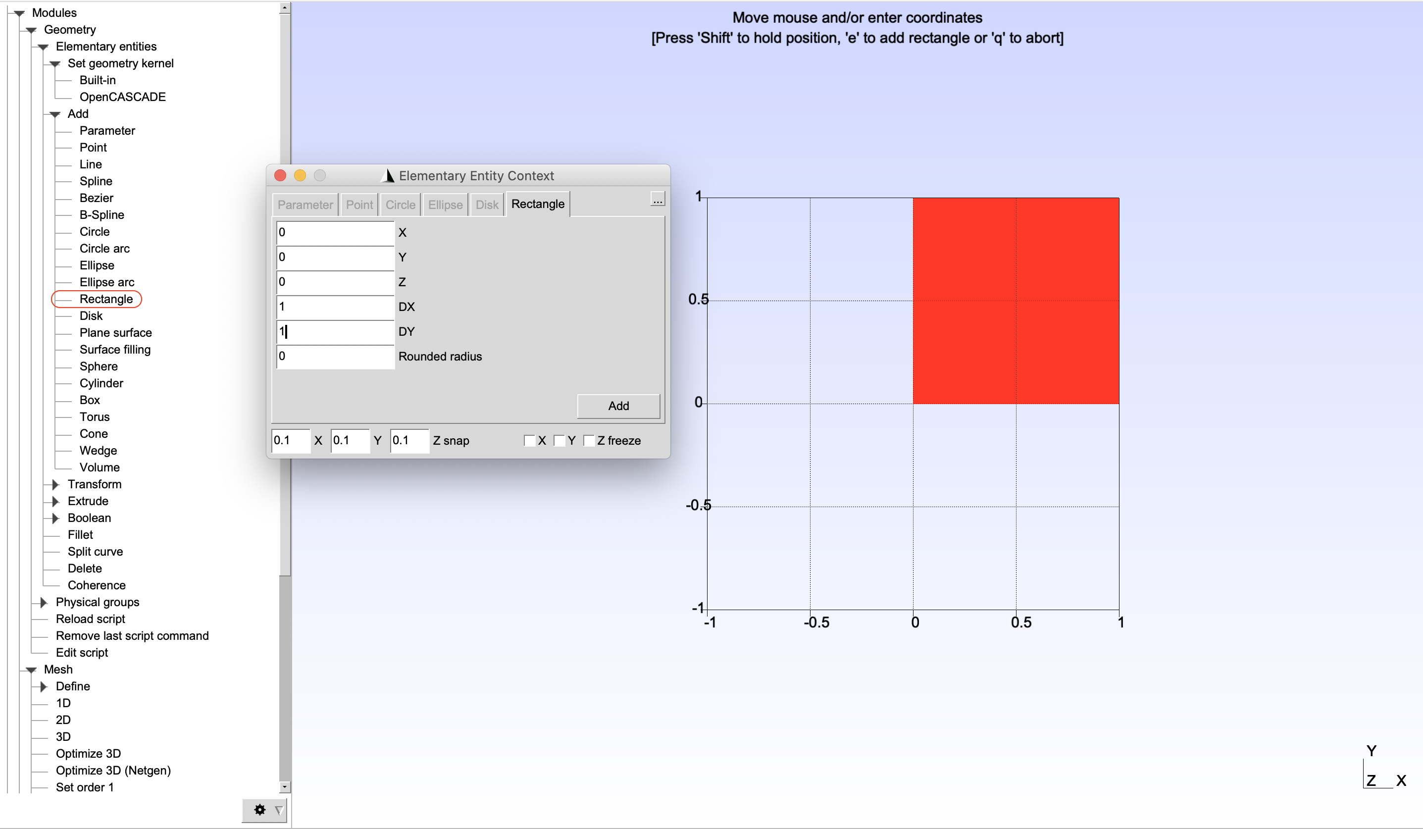 In order to create a geometry of a square, from the panel on the left, choose Modules -> Geometry -> Elementary entities -> Add -> Rectangle. Then provide the geometry inputs including location (X, Y, Z) and dimensions (DX, DY) as shown in Figure 1 and click Add and then press q on the keyboard to finish.