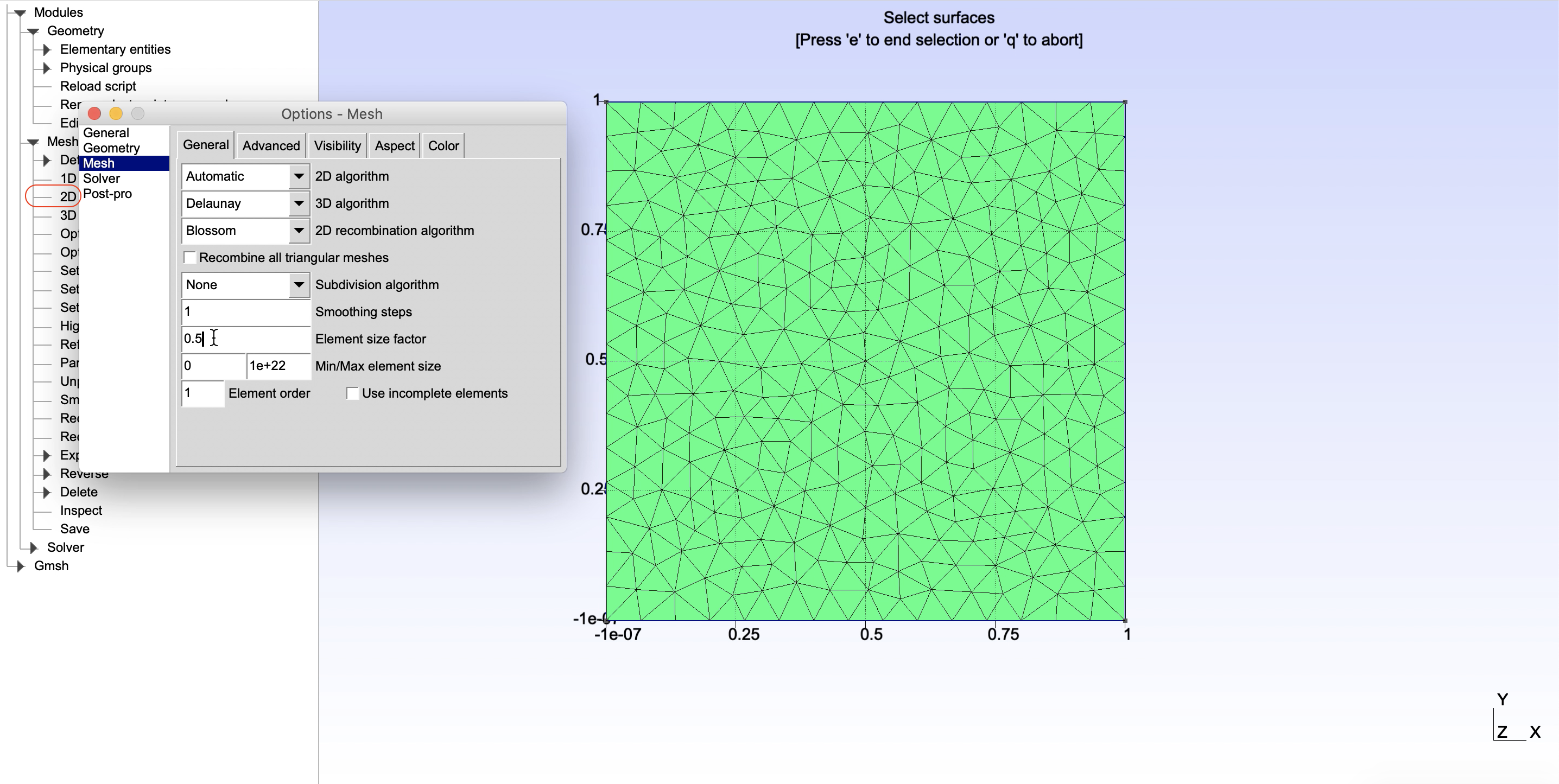 Go to Tools -> Options -> Mesh, in the General tab, choose the meshing algorithms and change the element size factor, e.g. 0.5 as shown in Figure 4, then close the window. To create the 2D mesh for the square, on the left panel, choose Modules -> Mesh -> 2D.