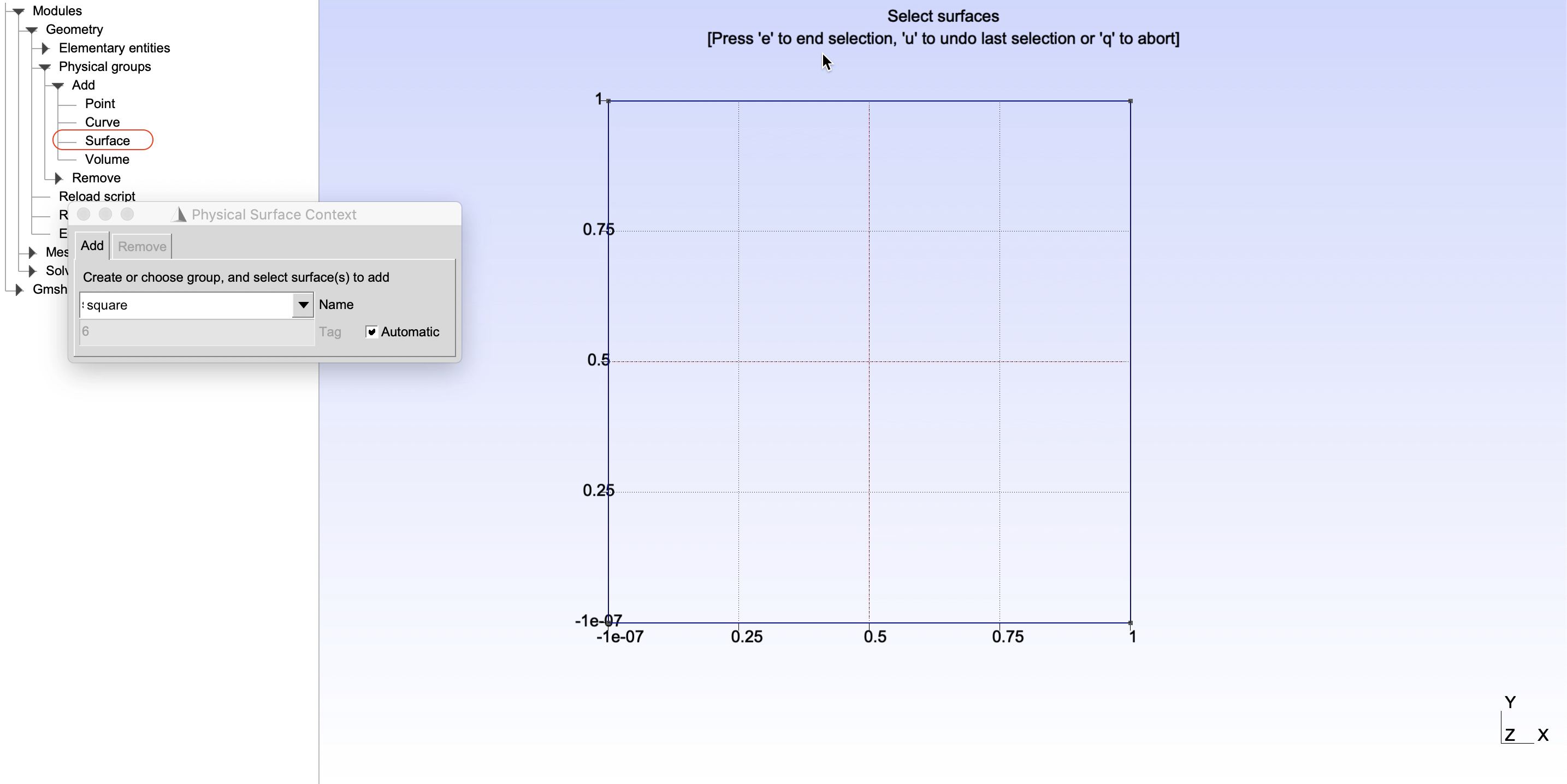 As a demonstration, in this part, physical groups of edges and surface of the 2D square will be defined as shown in Figure 2 and Figure 3. It can be done by choosing, from the left panel, Modules -> Geometry -> Physical groups -> Add -> Surface/Curve. Then give name of a physical groups in the box Name, select entities to add to the corresponding groups and finally press e to end the selection.