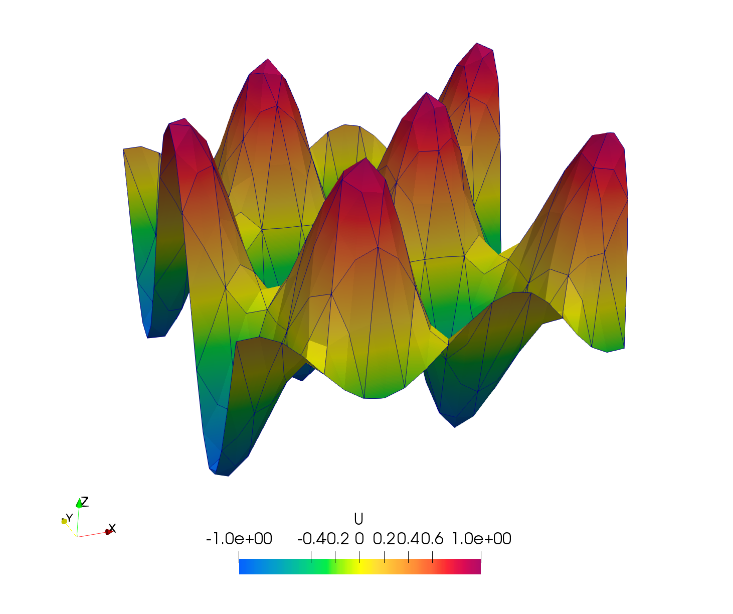 Then, run the analysis and get the newly created output file, namely out_result.h5m. Convert it to *.vtk format. Then open it in Paraview and use the filter WarpByScalar, you will be able to see the deformation as bellow: