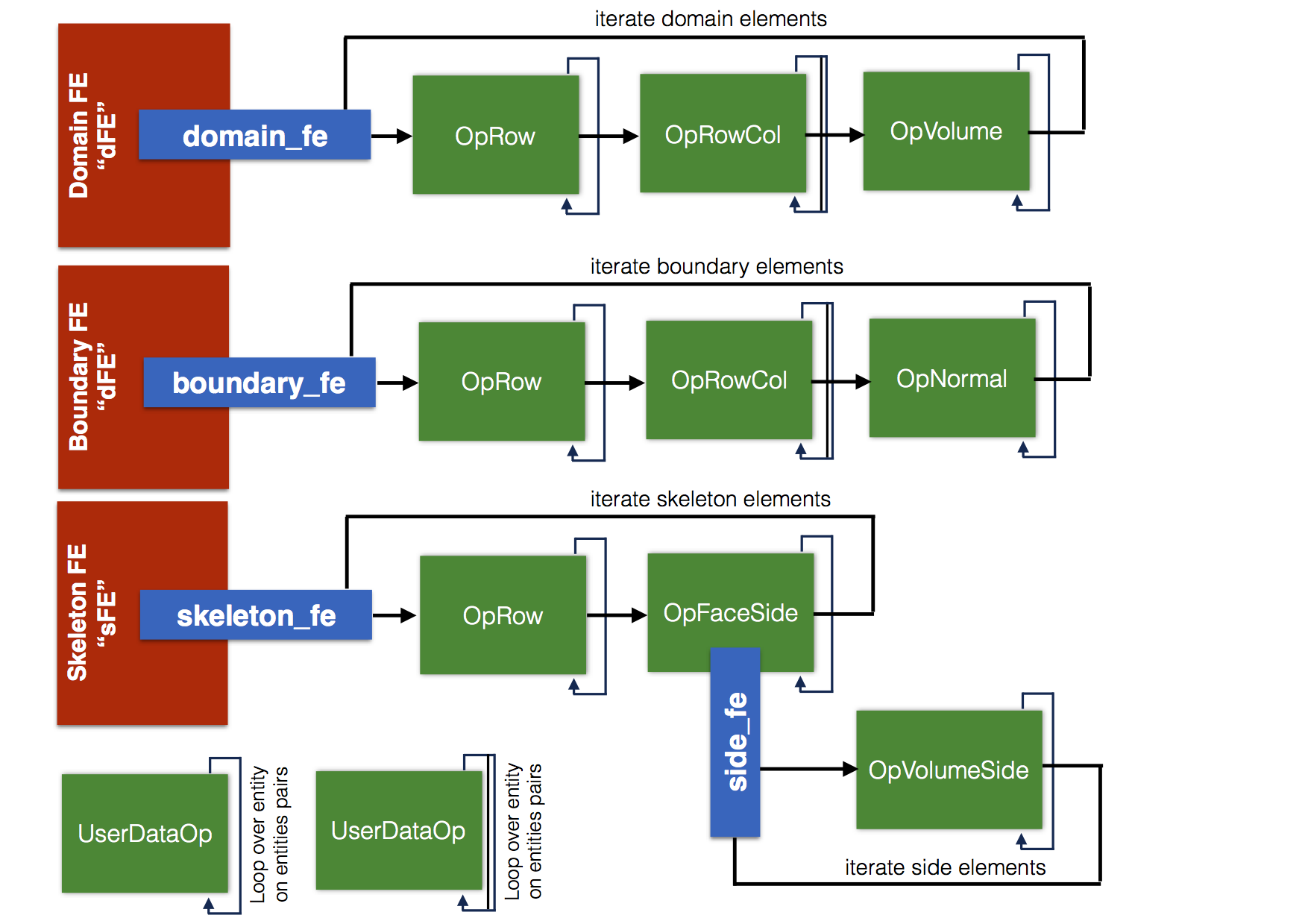 Finally, we get to the point when we can put our machine in motion, we iterate over finite elements and run sequences of user data operator for each of them.