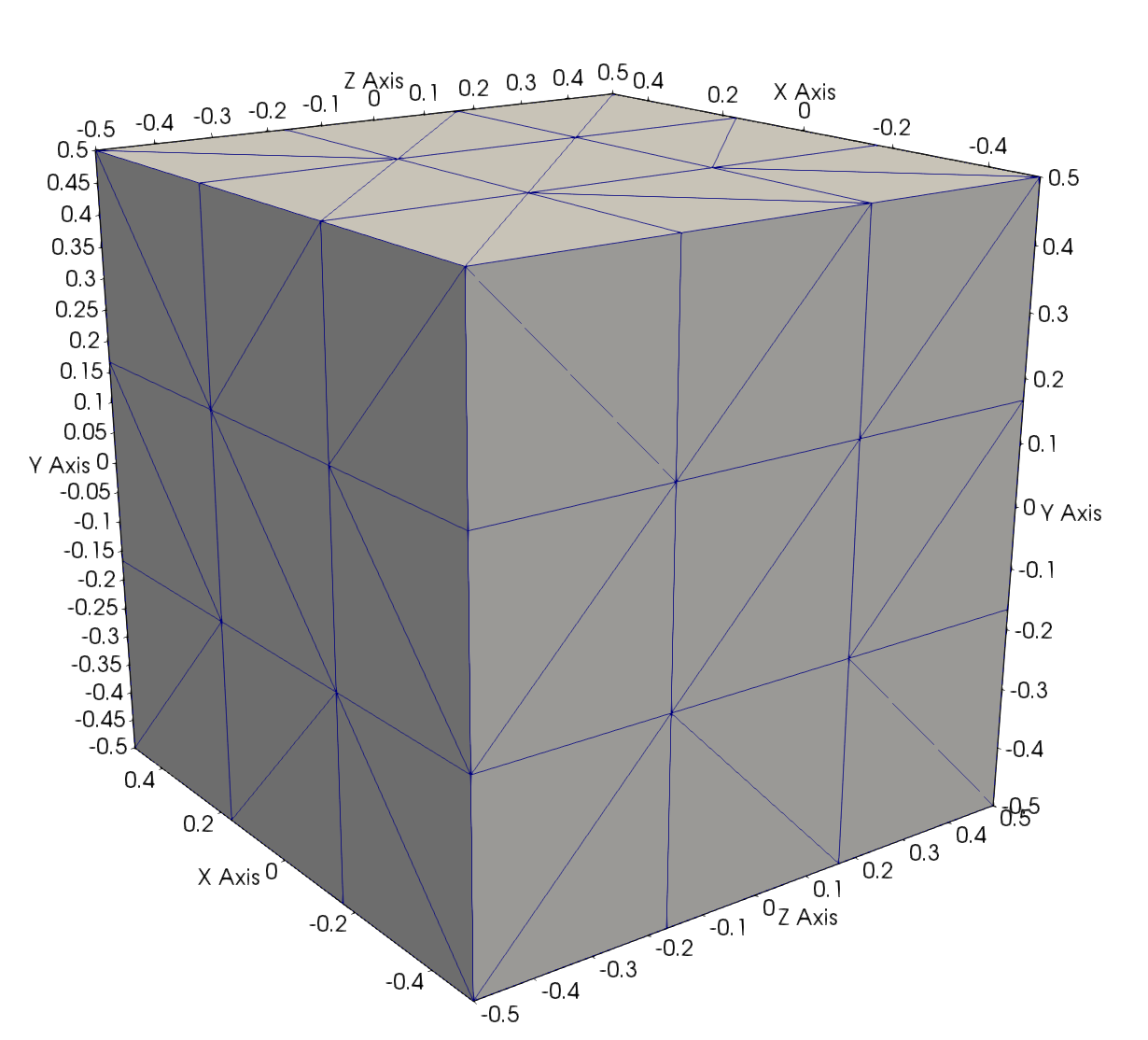 Code is executed for the mesh of a cube, see Figure 6, which has unit size for all edges and the coordinates origin is in the centre of the cube.