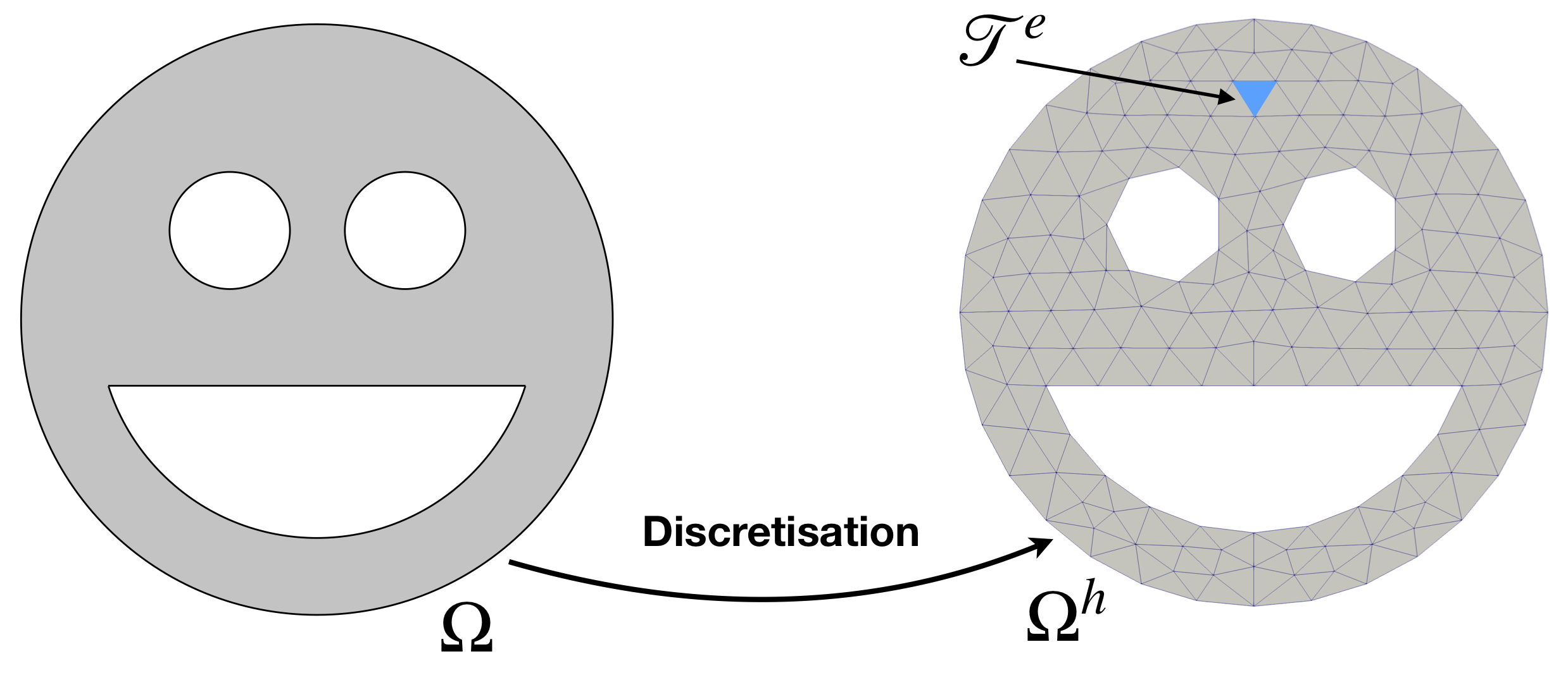 where \(\Omega^h\) is termed as the discretisation (approximation) of the domain \(\Omega\), see Figure 1. For the rest of the tutorials, we will be using \((\cdot)^h\) to indicate a reference of the given quantity the approximation. Note that subscript h historically refers to the lateral size of an element, e.g. maximal edge length.