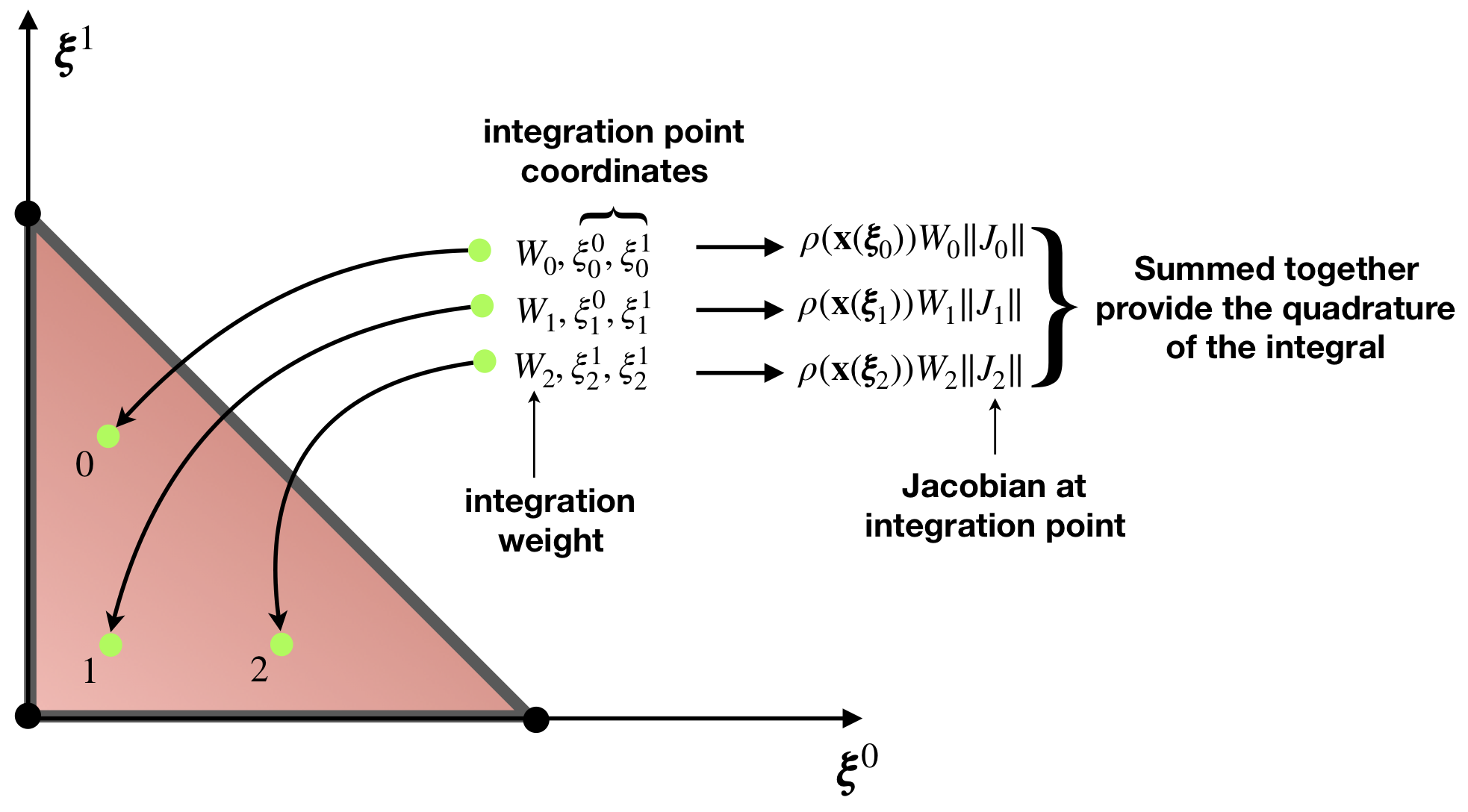\[ \begin{align} I_\mathcal{T} = \int_{\mathcal{T}} \rho(\mathbf{x})\, \textrm{d}x = \int\limits_{0}^{1}\int\limits_{0}^{1-\xi^0} \rho(\mathbf{x}(\boldsymbol{\xi})) \|\mathbf{J}\|\, \textrm{d}\xi^0\textrm{d}\xi^1, \end{align} \]