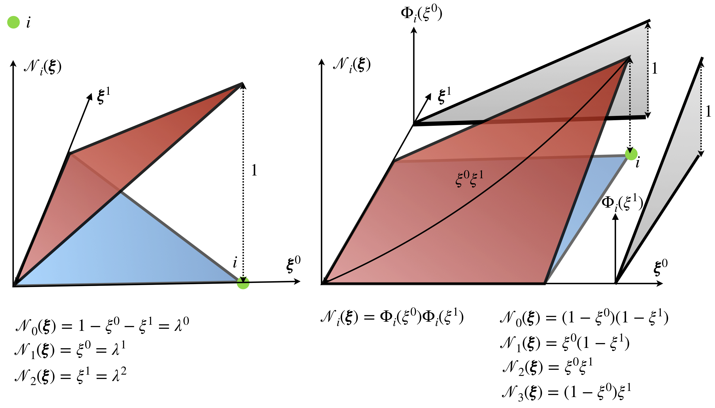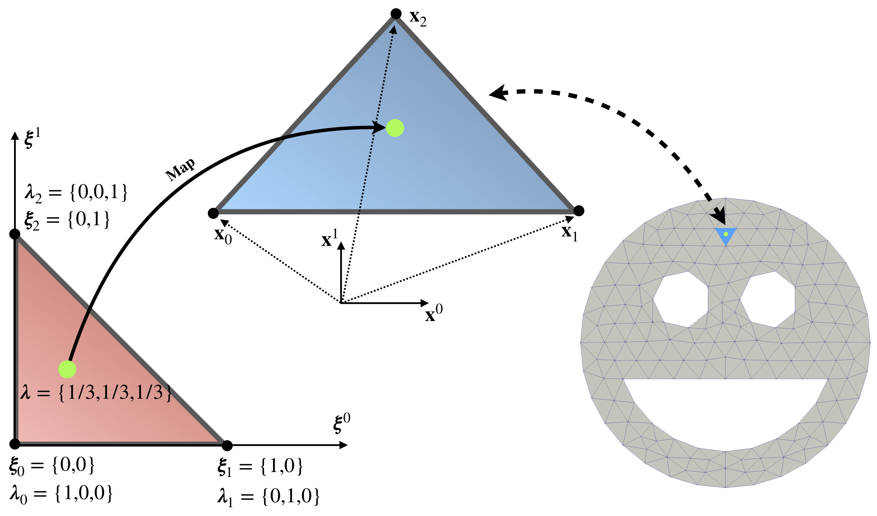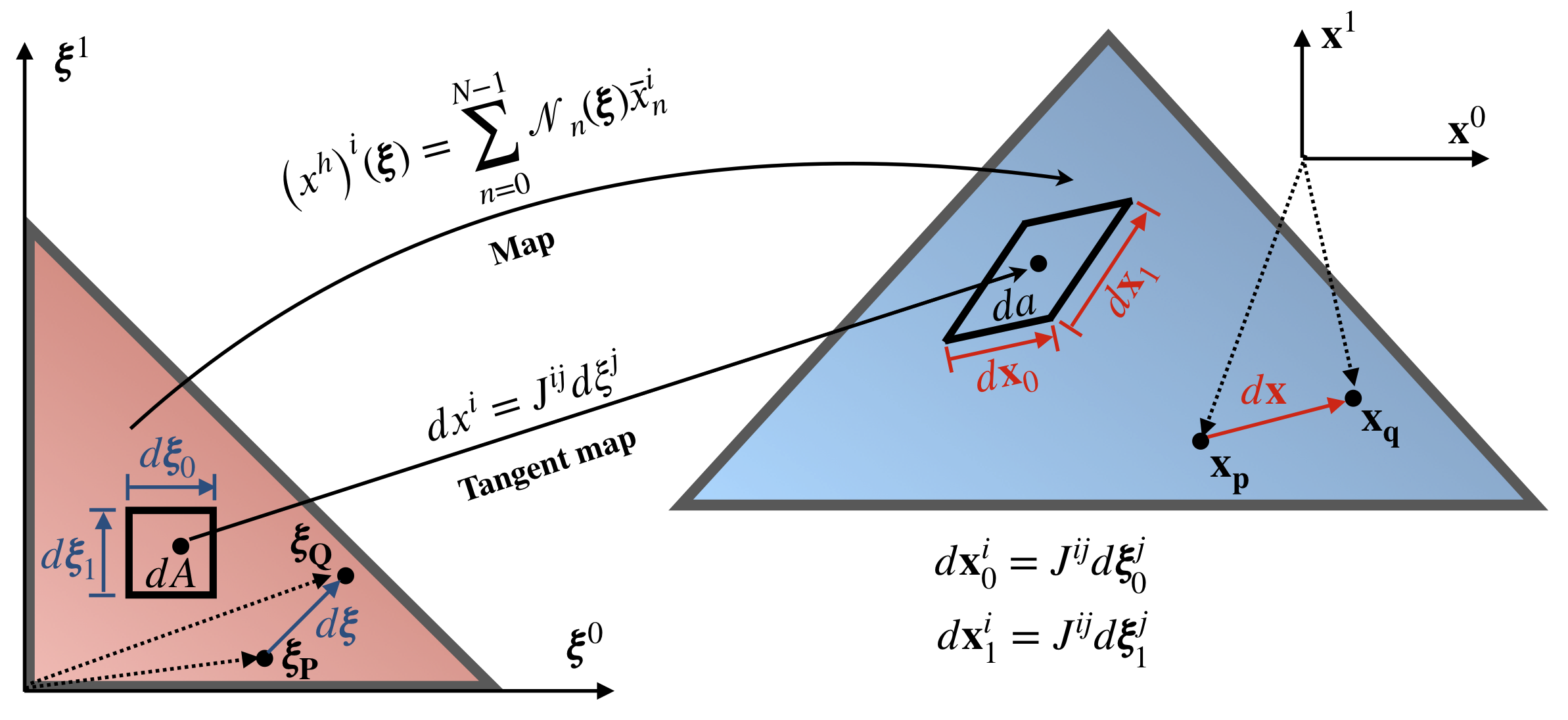 Figure 5 presents a map between the reference element (red triangle) and element in physical configuration (blue triangle). Maps transform, shift, rotate and stretch element, and establish one to one relation (at least for all points without element boundary) between coordinates in reference element \(\pmb\xi\) and physical coordinates \(\mathbf{x}\) as follows: