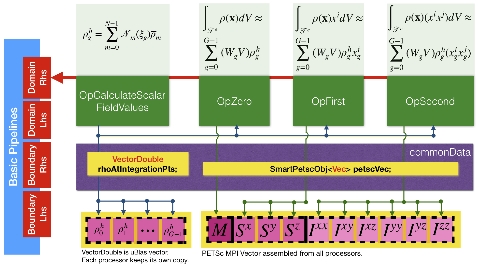 In the snippet above, you can see four operators pushed into the pipeline, as described in Figure 8. Operators are pushed to pipeline_mng->getOpDomainRhsPipeline, which is a pipeline to calculate vectors on domain finite elements. Note that operators are executed on each finite element in the order that they are pushed to the pipeline.