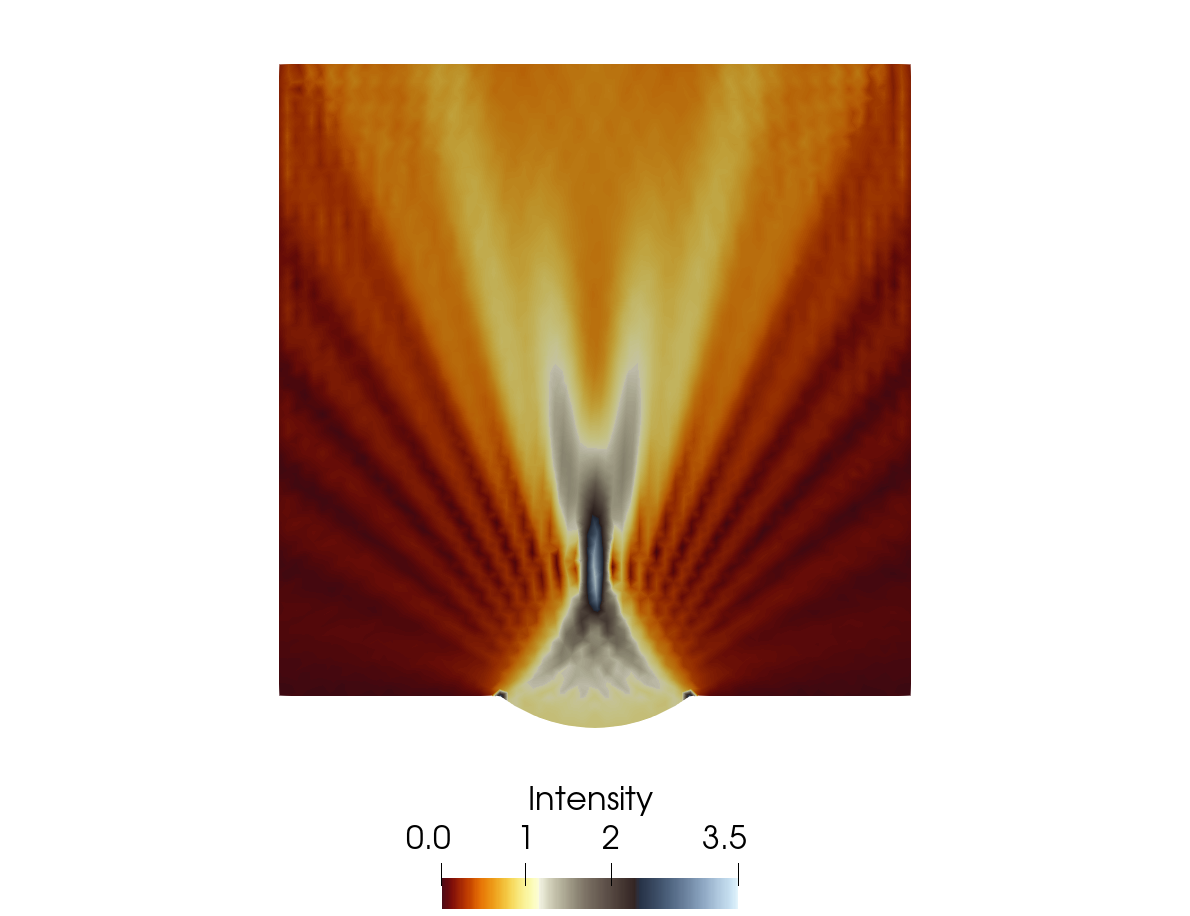 out_helmholtz.h5m, is generated. To convert the results from .h5m format into .vtk out_helmholtz.vtk file is openned in freely available postprocessing software the calculator solver must be used to evaluate from the solution of the fields P_REAL and P_IMAG by setting the name Intensity in the Result Array Name field and calculating the wave amplitude as \(\sqrt{\left(p^{\rm{Re}}\right)^2 + \left(p^{\rm{Im}}\right)^2}\) by substituting Result Array Name. The associated results are presented in Figure 3.