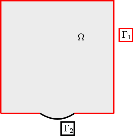 where the fields \(p^{\rm{Re}}\) and \(p^{\rm{Im}}\) are marked as P_REAL and P_IMAG, respectively. Furthermore, the space chosen is H1, the base is AINSWORTH_BERNSTEIN_BEZIER_BASE and dimension is 1 that corresponds to a scalar field. The field data is added both to Domain Element and Boundary Element from Simple Interface via invoking addDomainField and addBoundaryField, respectively. As it will be shown later, for a problem solved in \(\mathbb{R}^d\) where \( d \) is the problem dimension, Domain Elements perform operations on the mesh entities of the highest dimension ( \(\mathbb{R}^d\)) and Boundary Elements that perform operations on mesh entities of dimension \( d - 1\) that lie only on the boundary of the mesh, in this case \( \Gamma_1\) and \( \Gamma_2\).